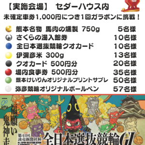 本日の発売 07日 - 09日 2月 FⅠ岐阜 土曜日 レース詳細 09日 - 11日 2月 FⅠ立川 月曜日 レース詳細 イベントは見つかりませんでした 新着記事 【ファンサービス】ガラポン抽選会 2/23全日本選抜競輪(熊本)場外発売中2026年2月8日information全文読む 【ファンサービス】ふるまいおでん(2/14・15=静岡記念場外発売中)2026年2月1日information全文読む 令和7年度 専門紙無料サービスデーにつきまして(2/6実施)2026年2月1日information全文読む 2026年1、2月 新潟支部所属選手の出走予定2026年1月23日News&Result,地元の出走予定全文読む 競輪場外車券売場「サテライト新潟」の閉館につきまして2026年1月20日information全文読む 日本競輪選手養成所 第131回(男子)選手候補生入所試験 新潟から池田悠生さんが合格2026年1月15日News&Result全文読む 神社側入場口の通行止めにつきまして(令和8年1月4日~3月31日)2025年12月15日information全文読む 令和7年度(2025年度)下半期 弥彦競輪場内食堂の営業日につきまして2025年12月14日information全文読む 12345›» Infomation一覧 New&Result一覧 月間日程 年間の日程はこちら Google MAP アクセス方法の詳細はこちら