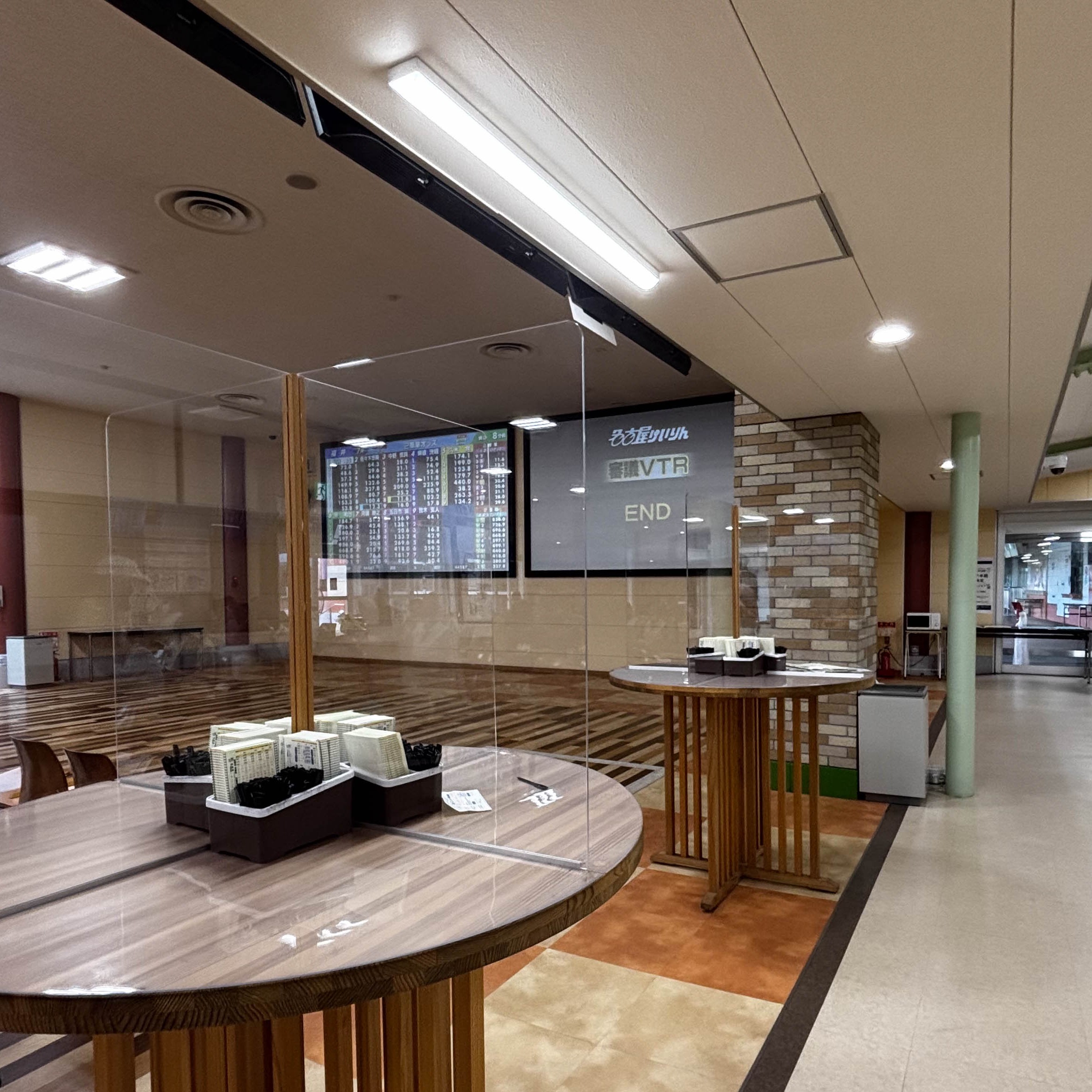 サービス施設 発売13窓・払戻5窓 、食堂・トイレ 、120インチマルチビション 、冷暖房完備 。入場料 無料