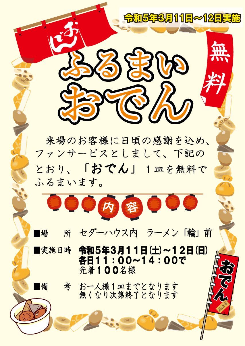 おでんふるまいのお知らせ(3/11-12) 3月 5, 2023 | information 3月11日(土)と12日(日)の二日間、弥彦競輪場内でおでんふるまいのファンサービスを行います。 ぜひお越しください! ふるまいおでん(各日先着 100食) 3月11日(土)~12日(日) 午前11時~午後2時頃(なくなり次第終了) ■場 所 弥彦競輪場セダーハウス内 ラーメン「輪」