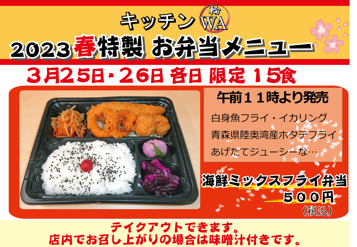 キッチンWA(特観席食堂)春特製お弁当販売のお知らせ 3月 22, 2023 | information だんだんと温かくなり、桜も咲き始め、春の陽気が感じられる季節になってきましたね。 さて、場内食堂キッチンWAでは、春の特製弁当として青森県産ホタテを使用した、海鮮ミックスフライ弁当を発売します。 ぷりぷりのホタテがジューシーで魅力的です✨(値段もお手ごろっ!) テイクアウトも可能ですので、ぜひご賞味ください! 〇発売日 令和5年3月25日・26日(土・日) 午前11時から各日限定15食で販売 〇場 所 特別観覧席棟食堂「キッチンWA」(テイクアウト可)