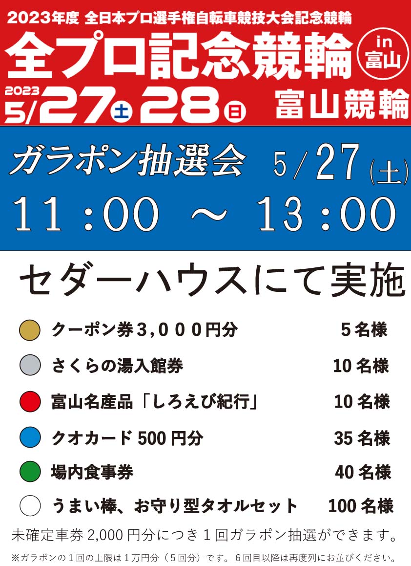 全プロ記念競輪ガラポン抽選会のお知らせ(5月27日) 5月 23, 2023 | information 全プロ記念競輪初日に、 ガラポン抽選会を下記のとおり実施いたします!! 富山名産品に加えて、 各種景品を用意しておりますので、 ぜひぜひご参加ください!! ~全プロ記念競輪 ガラポン抽選会~ ■実施日 5月27日(土) 全プロ記念競輪初日 11:00~13:00 (当たりが無くなり次第終了します。) ■実施場所 セダーハウス内 ■ガラポン抽選参加方法 未確定車券2,000円分で、1回回せます。 対象車券は、5月27日(土) 富山競輪、西武園競輪、久留米競輪ナイター車券になります。