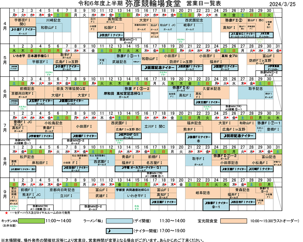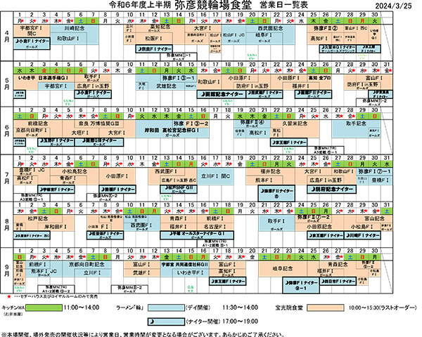 弥彦競輪場内食堂(寶光院食堂、ラーメン「輪」、キッチンWA)令和6年度上半期営業日につきまして 4月 12, 2024 | information 弥彦競輪場内の食堂(寶光院食堂、ラーメン「輪」、キッチンWA)の令和6年度上半期の営業日、営業時間は以下の画像、PDFデータ通りとなります。 画像または、リンク先のPDFファイルにてご確認ください。 令和6年度上半期 弥彦競輪場内食堂 営業日一覧表(PDFファイル)