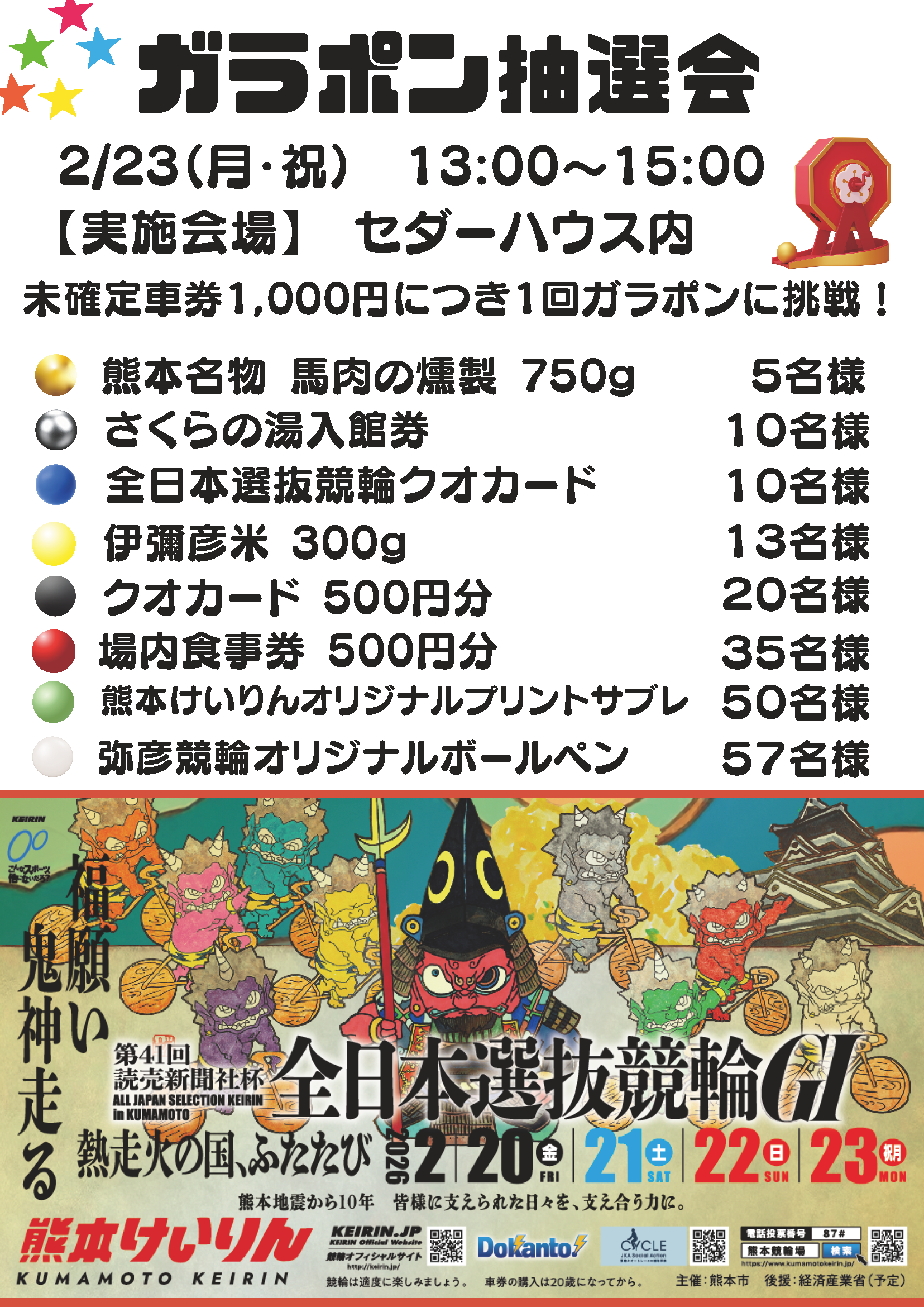 下記のとおり未確定車券ガラポン抽選を実施いたします。