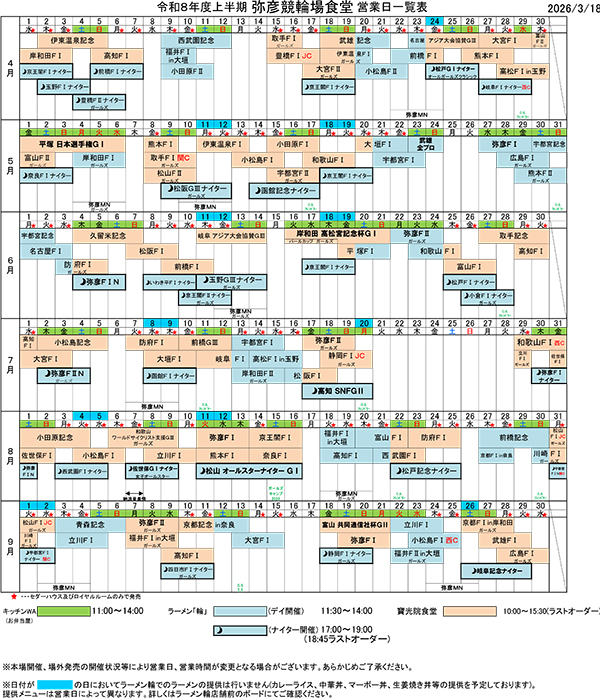 令和8年度(2026年度)上半期 弥彦競輪場内食堂の営業日につきまして 3月 19, 2026 | information 令和8年度(2026年度)上半期(4~9月)の弥彦競輪場内食堂の営業日につきましては、以下の表でご確認ください。 令和8年度上半期 弥彦競輪場内食堂営業日一覧(PDF)