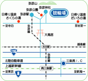 | ◆弥彦競輪場◆ 新潟県西蒲原郡弥彦村弥彦2621 ◆自動車 北陸道・三条燕ICから約30分 ◆JR 上越新幹線・燕三条駅から弥彦線に乗り換え、弥彦駅下車、徒歩15分 ◆弥彦競輪場行き無料バス(開催日毎日) ◆JR燕三条駅(三条口)発・臨時無料バス(弥彦記念のみ) |