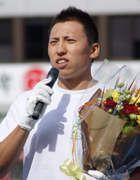 新人選手紹介に先立ち、相澤選手はCLUB SPIRITS所属・加瀬加奈子さんと、弥彦バンクで対決!! 相澤選手はバンク1周プラスハンデかつイエローラインを走行、加瀬さんは弥彦バンクの内外線間を1周で、1対1のガチンコ勝負を行いました。 その後、相澤選手は、「迫力ある競走を心掛けたい」と、ファンの皆様へ地元デビューに向けての抱負を語りました。 暖かい応援をよろしくお願いします。 |