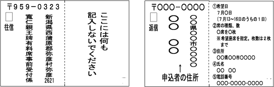 〒959-0323新潟県西蒲原郡弥彦村弥彦2621「寬仁親王牌有料席事前受付」係