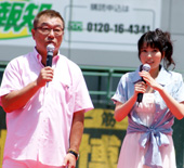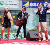 | 成田栞さんのステージ。プロデュースは中野浩一さん | 思い出の弥彦競輪場で熱唱する成田栞さん。 | 続いて、PEACE$TONEのステージ。さすがです。 |