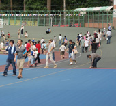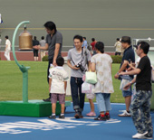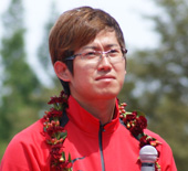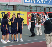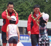 | ヴォーカル、asukaさん。 | 決勝戦選手紹介。弥彦小学校の児童からレイの贈呈。 | 決勝戦。注目を集めた脇本雄太。 |