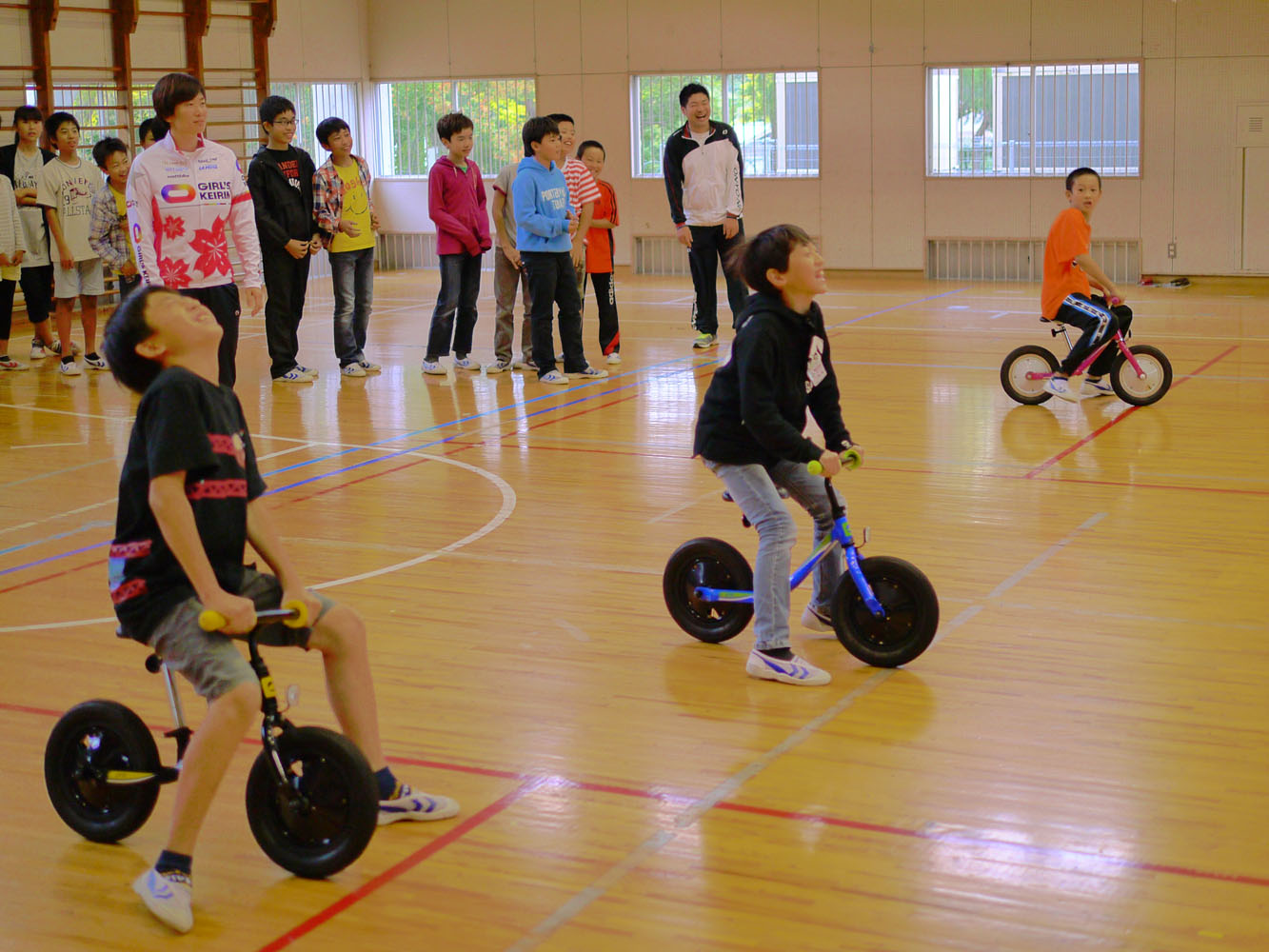 講演の後には、ストライダーを使用したチーム対抗戦もあり、