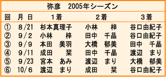 2005年8月21日。 弥彦バンクに初登場 多くのファンが見守る中、スタンド前 を1列になって周回。 初代女王は8番、杉本真理子さん 2005年9月2日、第2戦。 発走機を使ってスタート。より本物 の競輪に近くなる。 2005年10月6日、第6戦。 弥彦最終戦は渡辺まりさん。