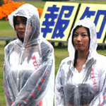 メンバーからは「えー」って声が上がっていたが、今日の雨には勝てません。雨カッパを着ての「レース中止、おわびのあいさつ」を行ったあと、代替イベントの「ジャンケン大会」が開催された。