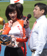 田中さんが徐々にペースを上げていく中、満を持して前回優勝の内田レナさんが発進。白倉晶子、宮本あみさんがピッタリ続き、歓声が響くスタンド前を通過して一気に先頭に立った。