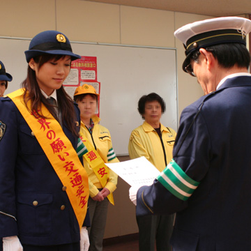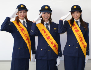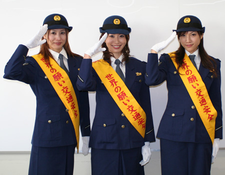 新潟県庁前で行われた交通安全運動出発式に参加後、婦警さん姿に変身して、新潟駅コンコースに登場。自転車マナー向上の啓蒙にひと役、買いました。