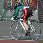 弥彦競輪の6R終了後、第1戦の馬場さんvsすぴ田中さんからイベントスタート。馬場さんはママチャリ、すぴ田中さんはいつものレーサー。すぴ有利は明らかな条件で、すぴ田中さんが完勝。