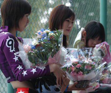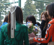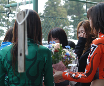 卒業レース終了。涙のメンバーから、花束が贈呈される